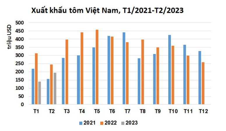 Tháng 2/2023, xuất khẩu tôm Việt Nam đạt 194 triệu USD, giảm 21% so với cùng kỳ. Lũy kế 2 tháng đầu năm nay, xuất khẩu tôm đạt 335 triệu USD, giảm 40%.