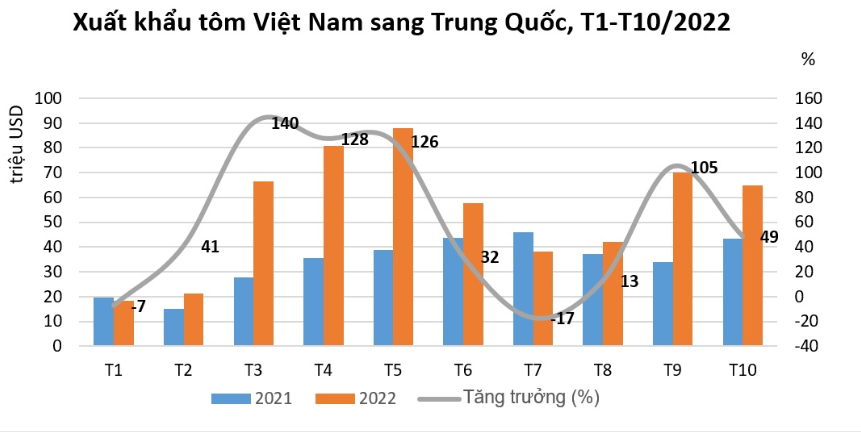 Theo Hiệp hội Chế biến và Xuất khẩu Thủy sản Việt Nam (VASEP), trong tháng 10/2022, xuất khẩu tôm Việt Nam sang Trung Quốc tăng 50% đạt 65 triệu USD. Đà tăng này giúp Trung Quốc vượt qua Mỹ, tiếp tục là thị trường nhập khẩu tôm lớn nhất của Việt Nam trong tháng 10.