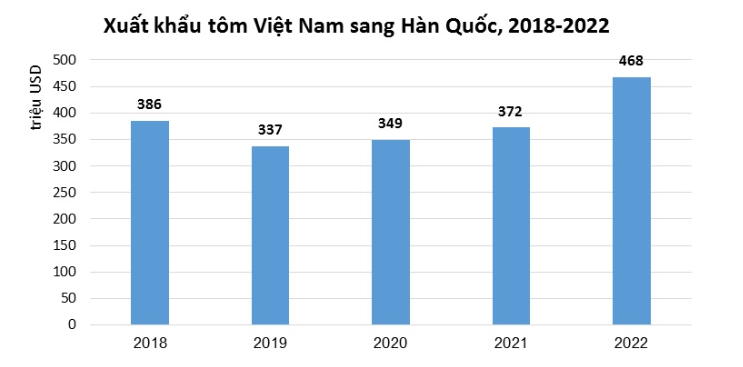 Trong 5 năm (2018-2022), xuất khẩu tôm Việt Nam sang Hàn Quốc tăng trưởng khá ổn định từ 386 triệu USD năm 2018 lên 468 triệu USD năm 2022, tăng 21%. Đặc biệt, các sản phẩm tôm chân trắng xuất khẩu sang Hàn Quốc tăng trưởng cao và liên tục từ năm 2019 đến nay.