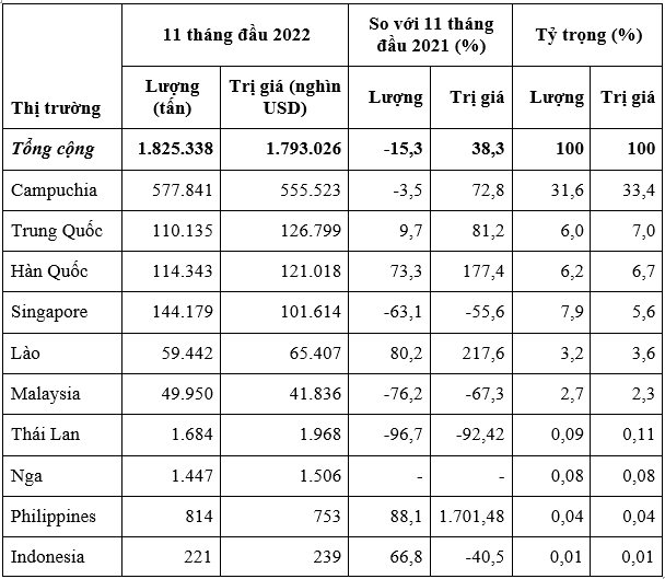 Tính chung 11 tháng đầu năm 2022 xuất khẩu đạt 1.825.338 tấn, trị giá 1,79 tỷ USD, giảm 15,3% về lượng và tăng 38,3% về trị giá.