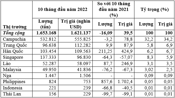 Tính chung 10 tháng đầu năm 2022 xuất khẩu đạt 1.653.168 tấn, trị giá 1,62 tỷ USD, giảm 16% về lượng và tăng 39,5% về trị giá.