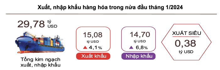 Trong nửa đầu tháng 1/2024, tổng kim ngạch xuất nhập khẩu hàng hóa của Việt Nam đạt 29,78 tỷ USD, tăng 5,4% so với cùng kỳ năm trước. Đã có 4 nhóm hàng đạt kim ngạch trên 1 tỷ USD.