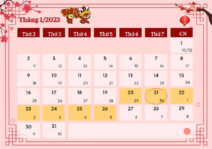 Theo lịch nghỉ Tết đã được Bộ Lao động Thương binh & Xã hội thông báo, Tết Nguyên đán 2023 người lao động sẽ được nghỉ 7 ngày kể từ thứ Sáu ngày 20/1/2023 đến hết thứ Năm ngày 26/1/2023 dương lịch (tức ngày 29 tháng Chạp năm Nhâm Dần đến hết ngày mùng 5 tháng Giêng năm Quý Mão).
