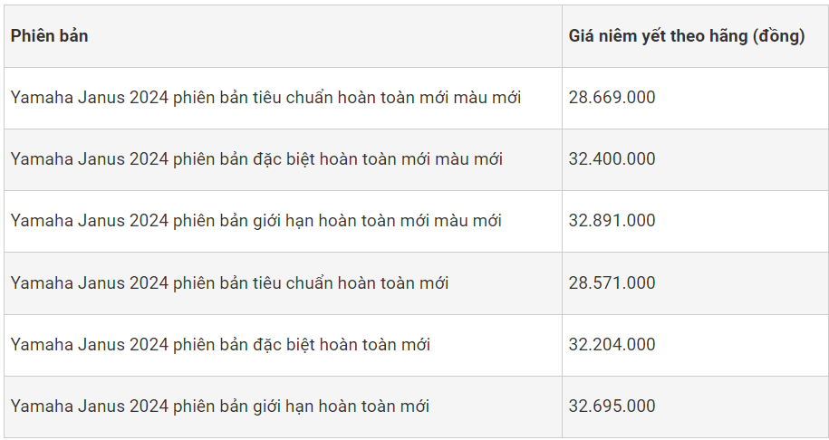 Lưu ý: Giá xe Janus 2024 ở trên đã gồm thuế VAT, chưa bao gồm lệ phí trước bạ và phí cấp biển số, bảo hiểm xe máy.