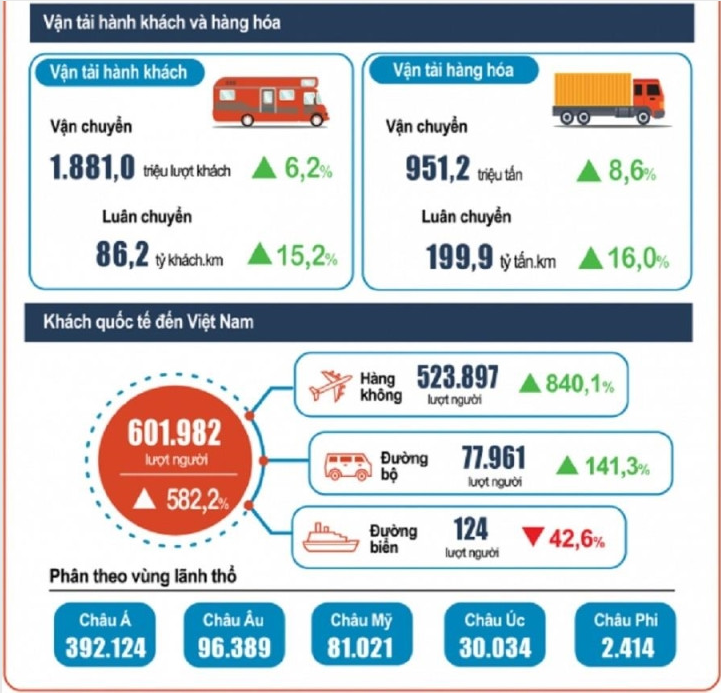 Trong tổng số gần 602 nghìn lượt khách quốc tế đến Việt Nam 6 tháng đầu năm nay, khách đến bằng đường hàng không đạt 523,9 nghìn lượt người, chiếm 87% lượng khách quốc tế đến Việt Nam và gấp 9,4 lần so với cùng kỳ năm trước; bằng đường bộ đạt 78 nghìn lượt người, chiếm gần 13% và gấp 2,4 lần; bằng đường biển đạt 124 lượt người, chiếm 0,02% và giảm 42,6%.