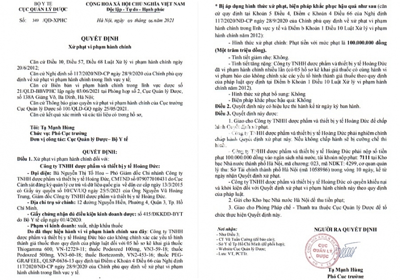 Cụ thể, ngày 9/6/2021 Cục Quản lý Dược ban hành Quyết định số 349/QĐ-XPHC, xử phạt vi phạm hành chính đối với Công ty TNHH dược phẩm và thiết bị y tế Hoàng Đức (địa chỉ tại số 12 Nguyễn Hiền, phường 4, quận 3, TP. Hồ Chí Minh) do ông Nguyễn Vũ Hoàng Trung là Giám đốc.