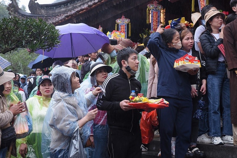 | Người dân đội mưa đi lễ, khai hội chùa Hương. |