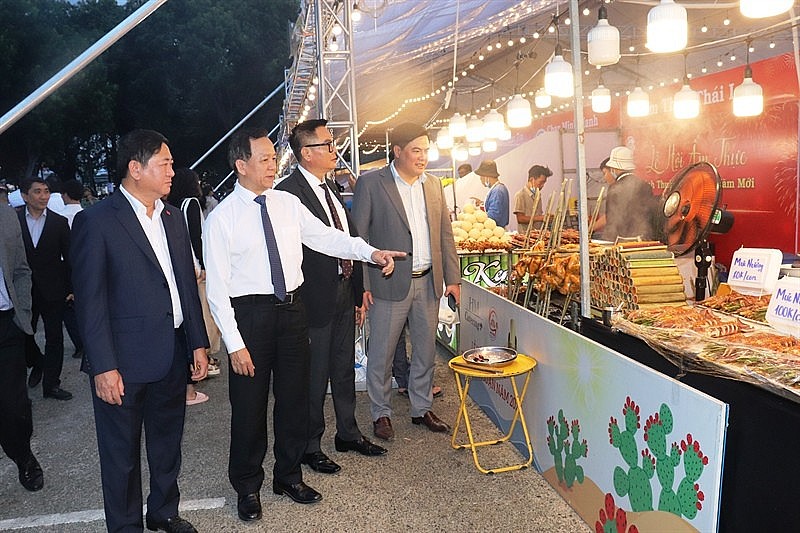 | Chủ tịch UBND tỉnh Trần Quốc Nam cùng các đại biển tham quan các gian hàng ẩm thực. |