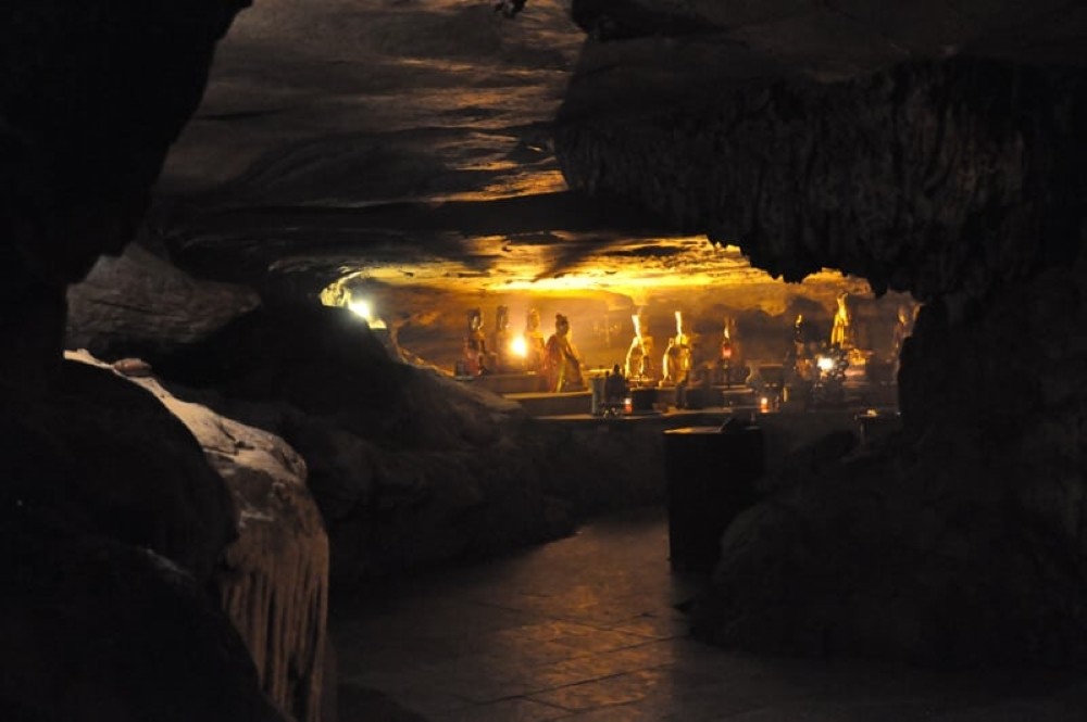 Vượt qua 300 bậc đá lên tới cổng tam quan, chưa rẽ vào cổng vội nhìn sang bên cạnh dốc có một ngã ba là lối dẫn hang sáng và động tối.