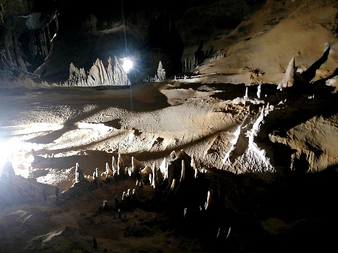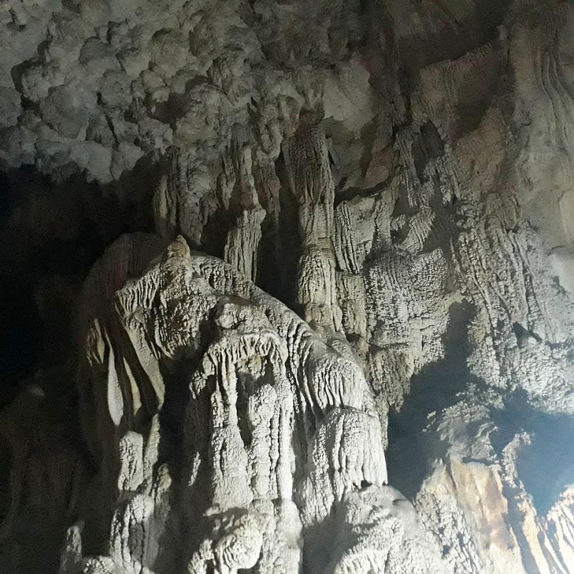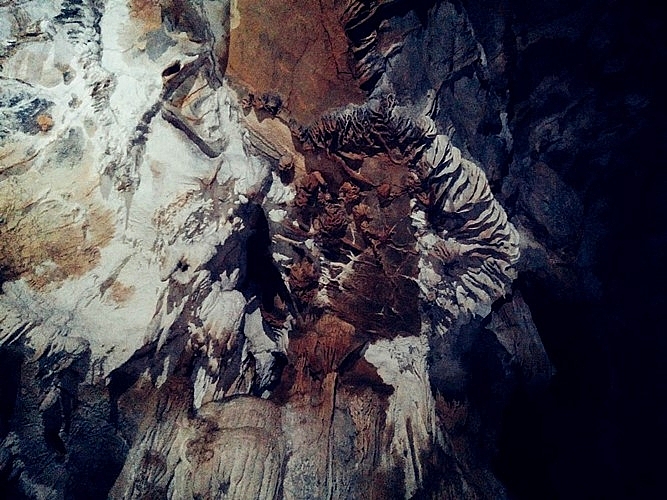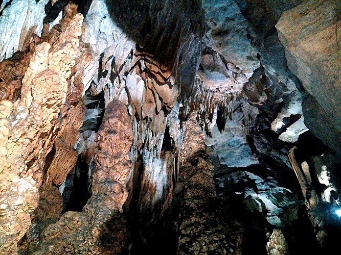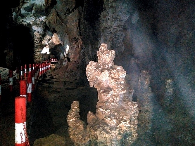 | Những nhũ đá trải qua hàng nghìn năm, với lấp lánh ánh sáng khi chiếu đèn, tạo cảm giác lôi cuốn khách thăm quan |