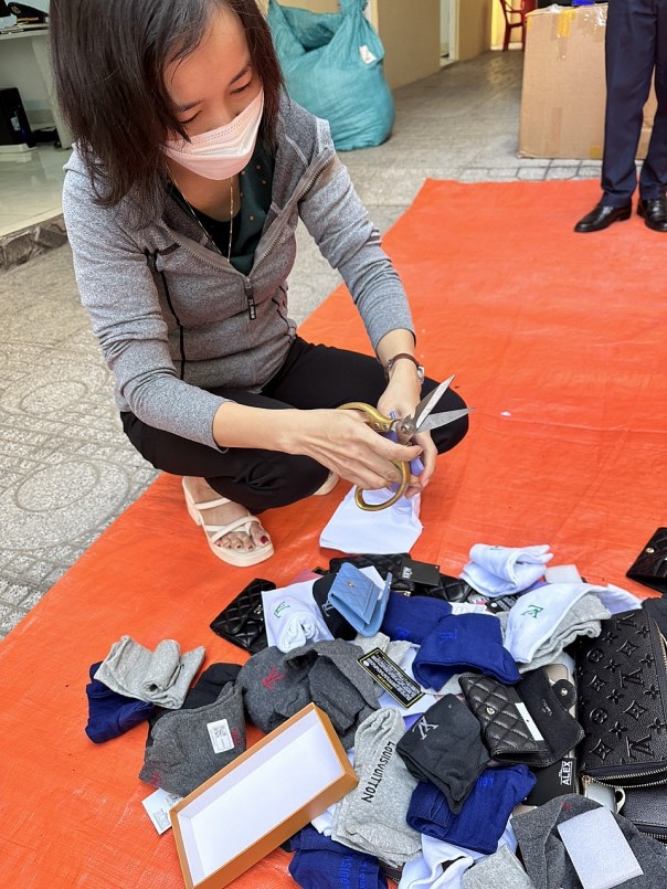 Hàng hóa vi phạm trong đợt tiêu hủy là quần áo, vớ, túi xách, nón giả mạo nhãn hiệu Louis Vuitton, Chanel, Adidas, NIKE… Phương thức tiêu hủy sử dụng biện pháp cơ học dùng dao, kéo cắt thành nhiều mảnh làm mất hoàn toàn giá trị sử dụng, hủy hình dạng ban đầu và được đưa đến nơi tập kết bãi rác thải để Công ty Môi trường đô thị thành phố Nha Trang xử lý theo quy định.