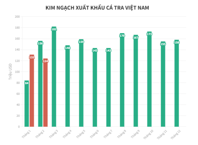 Theo VASEP, tháng 2/2024, giá trị xuất khẩu cá tra Việt Nam sang các thị trường hầu như sụt giảm 2 con số sau khi tăng mạnh trong tháng trước đó, chủ yếu do kỳ nghỉ Tết Nguyên đán. Tuy nhiên giá xuất khẩu nhìn chung vẫn tăng hoặc giữ ở mức ổn định. Nửa đầu tháng 3/2024, kim ngạch xuất khẩu cá tra sang các thị trường đạt 74 triệu USD, giảm 18% so với cùng kỳ. Tính đến ngày 15/3/2024, xuất khẩu cá tra đạt 329 triệu USD, giảm 0,05% so với cùng kỳ năm 2023.