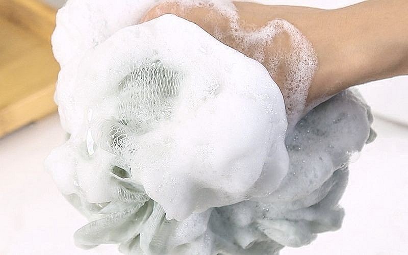 Bước 2: Vệ sinh cơ thể bằng nước ấm. Cho hỗn hợp sữa tắm lên bông tắm hoặc dùng tay để tạo bọt mịn.