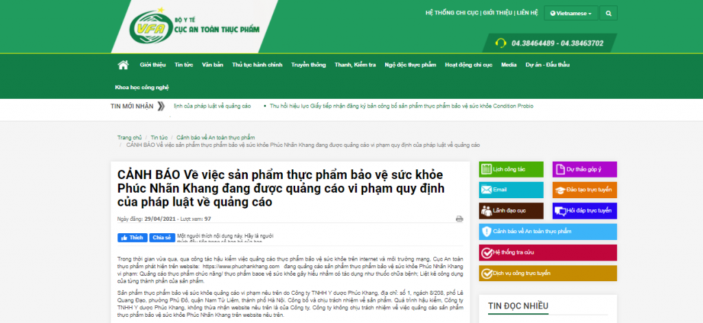 Quá trình hậu kiểm, Công ty TNHH Y dược Phúc Khang không thừa nhận website nêu trên là của Công ty, Công ty không chịu trách nhiệm về việc quảng cáo sản phẩm thực phẩm bảo vệ sức khỏe Phúc Nhãn Khang trên website nêu trên.
