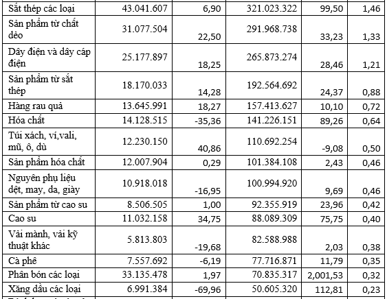 Nhìn chung trong năm 2021, hầu hết các nhóm ngành hàng xuất khẩu sang Hàn Quốc đều đạt kim ngạch xuất khẩu tăng trưởng. Một số nhóm ngành hàng có kim ngạch xuất khẩu tăng khá cao: Xuất khẩu phương tiện vận tải và phụ tùng tăng 32%; xơ sợi dệt các loại tăng 65,2%; dây điện và dây cáp điện tăng 28,4%; sắt thép các loại tăng 99,5%; hóa chất tăng 94%; cao su tăng 75,7%; đá quý, kim loại quý và sản phẩm tăng 81,8%; than tăng 236,1%.