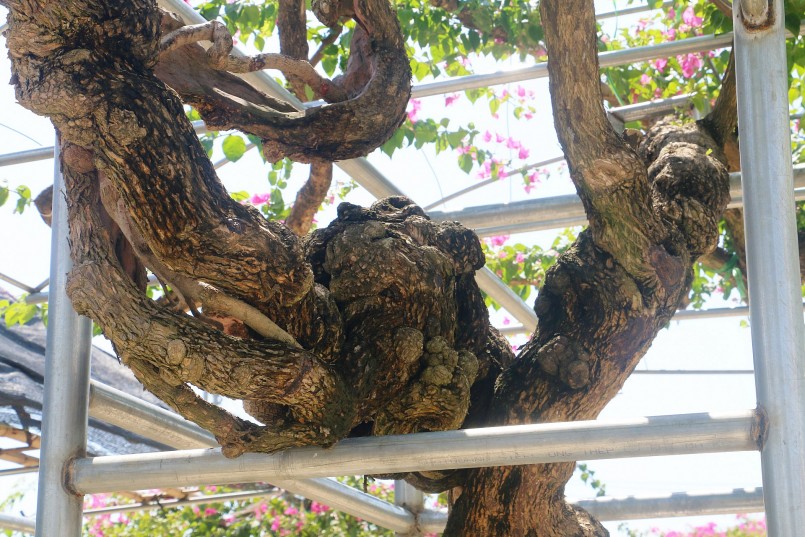 | Thế uốn lượn, bắt mắt khá "độc lạ" của một cây hoa giấy cổ thụ trong bộ sưu tập của anh Trường. |