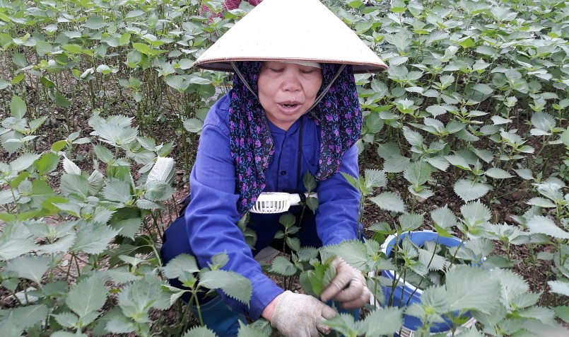 | Công nhân hái lá tía tô tại trang trại của Công ty Hồ Gươm. |
