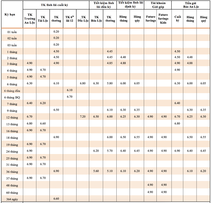 Ngân hàng điều chỉnh tăng 0,5 điểm % đối với lãi suất cho tiền gửi có kỳ hạn 6 tháng và 9 tháng, lần lượt lên mức 6,1%/năm và 6,5/năm.