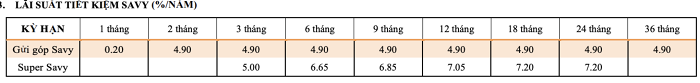 Trong đó, đáng chú ý là sản phẩm tiết kiệm Savy với lãi suất trong khoảng 5 - 7,2%/năm, tăng 0,5 - 1,25 điểm % so với tháng trước với mức tăng nhiều nhất được ghi nhận tại kỳ hạn 3 tháng.
