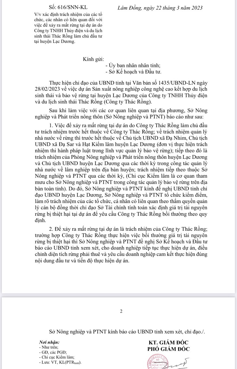| Sở Nông nghiệp và Phát triển Nông thôn tỉnh Lâm Đồng ký báo cáo số 616/SNN-KL gửi UBND tỉnh này. |