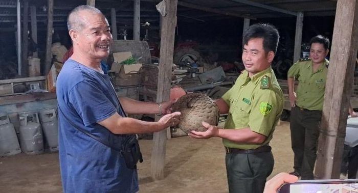Thấy con tê tê trong vườn nhà, một hộ dân đã bắt nhốt và chủ động giao nộp cho cơ quan chức năng để thả về rừng tự nhiên.