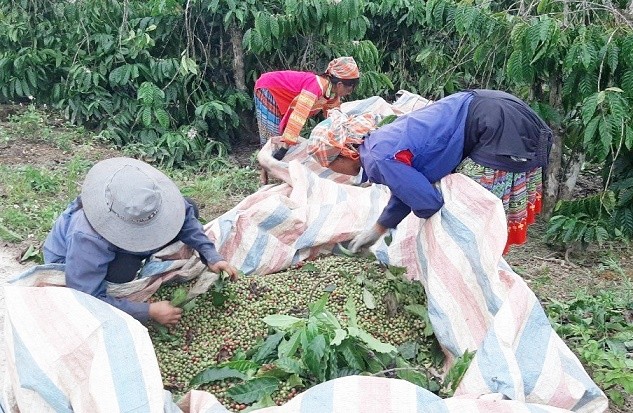 | Người dân Lâm Đồng thu hoạch cà phê. |