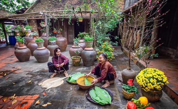 | Các cụ bà sửa soạn gói bánh chưng bên ngôi nhà cổ ở Làng cổ Đường Lâm. |