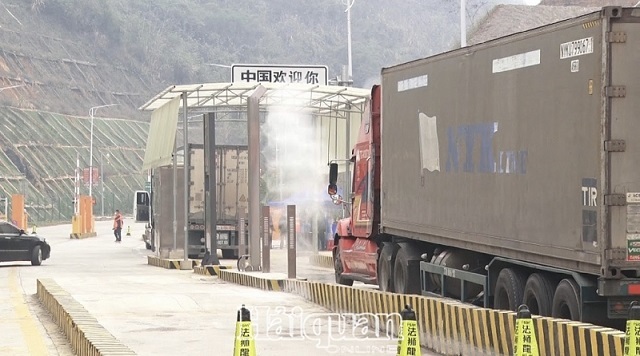 Tình trạng thông quan chậm do phía Trung Quốc thực hiện nghiêm ngặt quy trình tiêu độc, khử trùng cho phương tiện. Ảnh: Sơn Hải