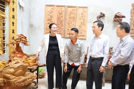 Đoàn công tác đến thăm cơ sở sản xuất đồ gỗ mỹ nghệ của anh Nguyễn Văn Lĩnh, thôn Bái Trung, xã Hòa Lộc. |
