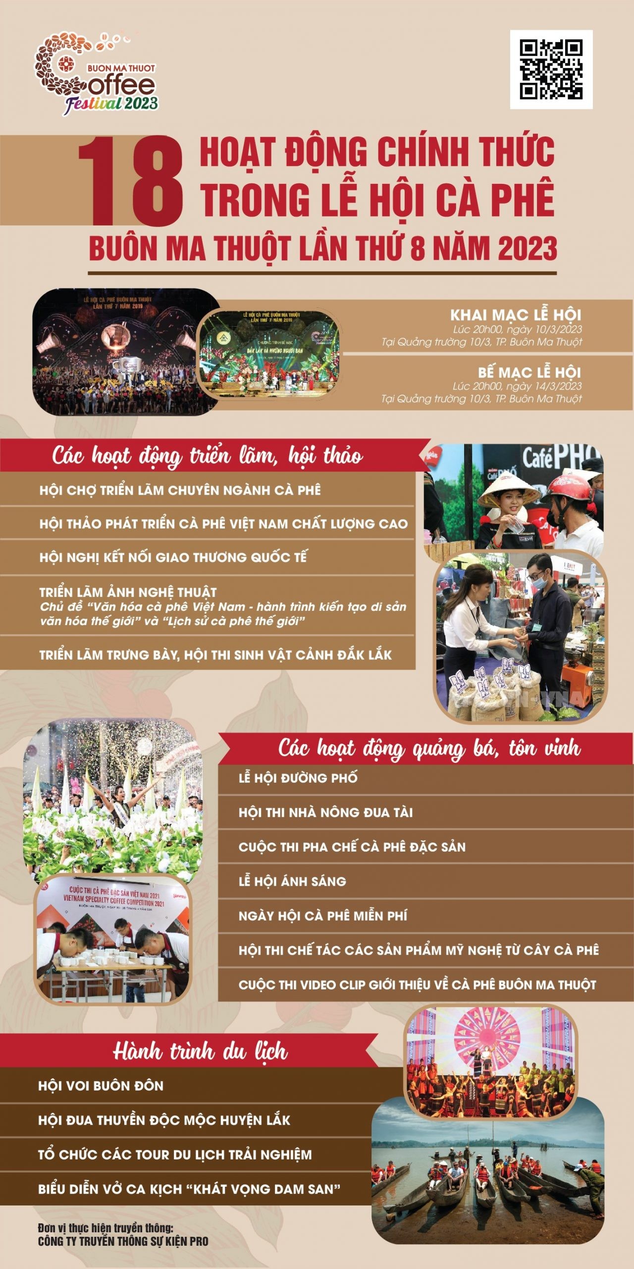 Lễ hội Cà phê Buôn Ma Thuột lần thứ 8 năm 2023 sẽ có 18 hoạt động chính thức gồm: