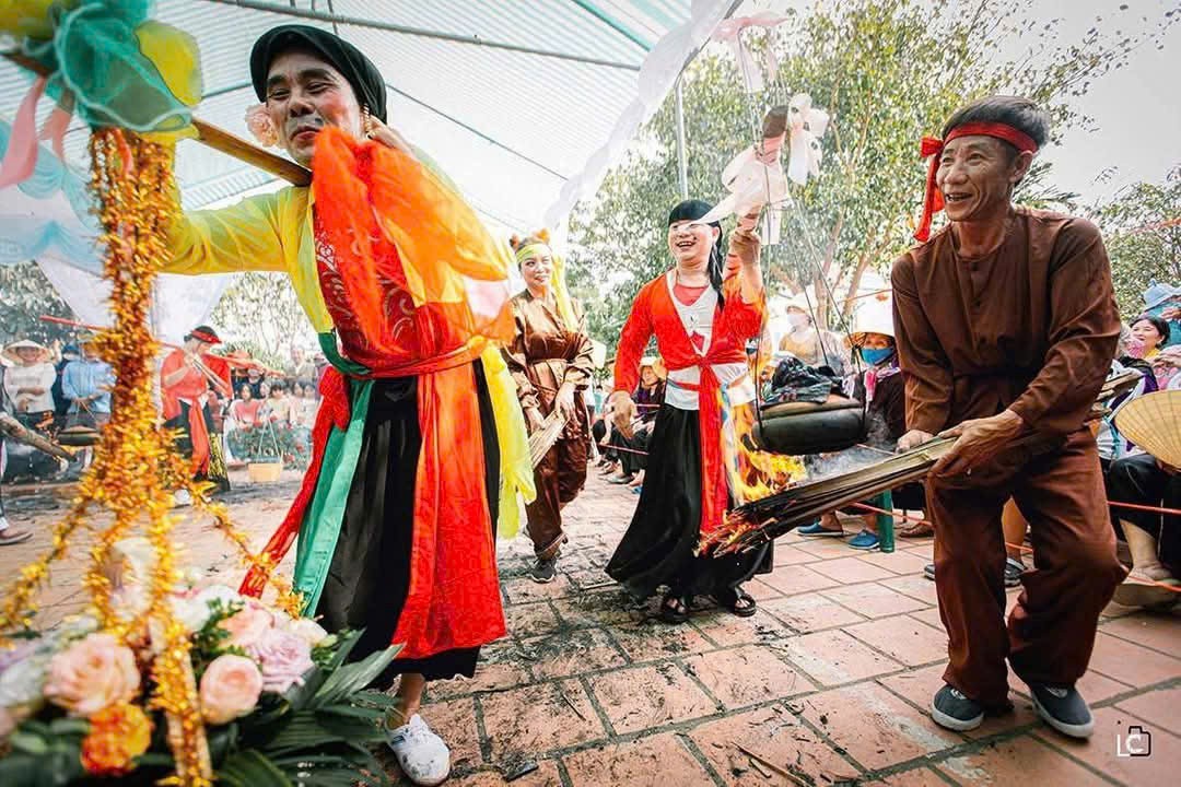 Sau nghi thức dâng hương là nghi thức đánh trống khai mạc. Thủ nhang cậu Vũ Ngọc Chinh đọc bài chúc văn được sửa soạn công phu ca ngợi công đức của Tứ Vị Thánh Nương cùng các vị thánh thần có công hộ Quốc an dân. Buổi chiều sẽ là nghi lễ tế thần truyền thống với nghi thức trang trọng của các cụ cao niên trong làng.
