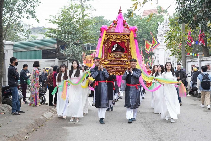 | Đoàn rước kiệu đi qua các tuyến phố chính của phường Định Công. |
