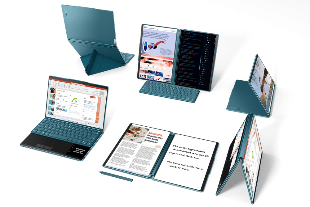 Yoga Book 9i có thể vừa là một chiếc laptop hoạt động với hai màn hình hiển thị và bàn phím rời, cũng có thể là một chiếc tablet cảm ứng, hoặc có thể sử dụng một màn hình để làm bàn phím và trackpad ảo, cũng có thể sử dụng như một cuốn sách.