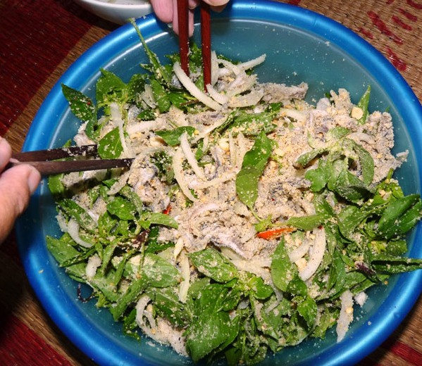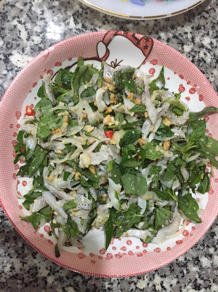 Rồi rắc trên mặt đĩa gỏi đậu phộng rang giòn, ớt đỏ xắt lát, thêm bánh tráng nướng, bánh tráng cuốn, nước chấm. Vậy là đã có bữa gỏi cá dỗi ngon lành. Cá dỗi thịt thơm dai và ngọt hơn cá trích, cá mai nên được nhiều người ưa chuộng.