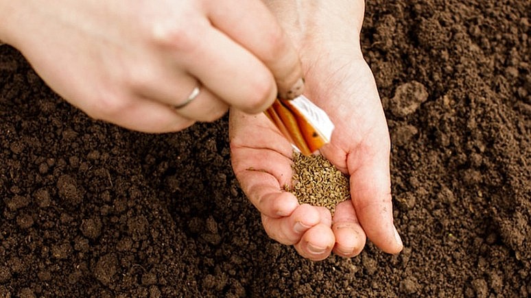 Nếu trồng trong chậu, hãy rắc hạt lên bề mặt và phủ nhẹ bằng một lớp đất mỏng. Hãy rải hạt càng đều càng tốt.