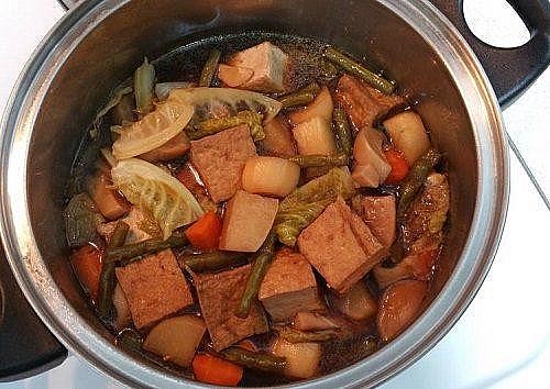 Cho bắp non vào luộc cho mềm cho ngọt nước. Tiếp đến cho cà rốt, củ cải, khoai tây vào đun cùng. Cuối cùng là cho nấm tươi vào.