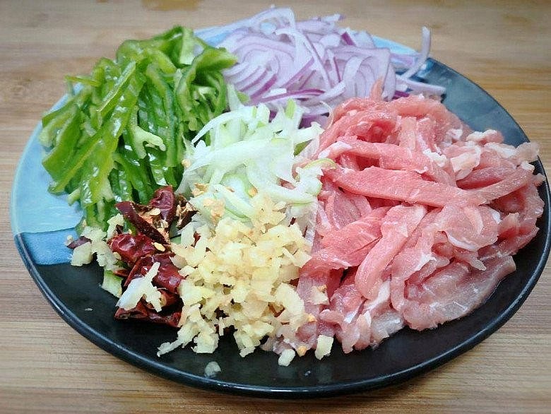 Cắt hành tây và ớt xanh thành sợi mỏng. Thịt lợn rửa sạch, thái thành từng miếng nhỏ. Hành boa rô thái nhỏ, ớt khô cắt miếng nhỏ, gừng thái sợi.