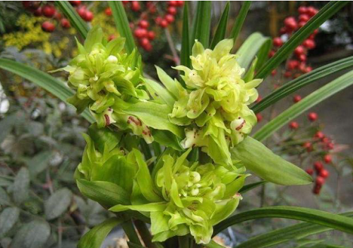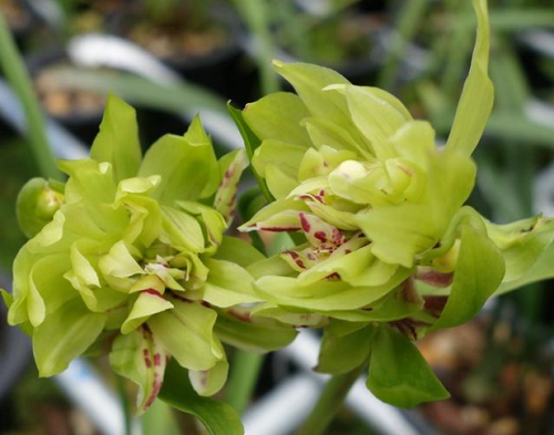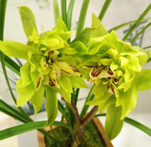 Loài hoa này còn có tên gọi khác là lan hoa cúc, cúc bướm. Bởi nó có 10 - 20 cánh hoa xếp chồng lên nhau, nở bung trông rất giống hoa cúc, khi thì giống con bướm đậu trên hoa cúc. Hoa có màu xanh ngọc, lá mỏng màu xanh.