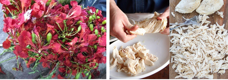 Thịt gà thường sử dụng phần thịt trắng, đem luộc chín rồi xé phay. Hoa phượng chọn những bông hoa to, đẹp, không bị dập nát về rửa sạch, để ráo nước.