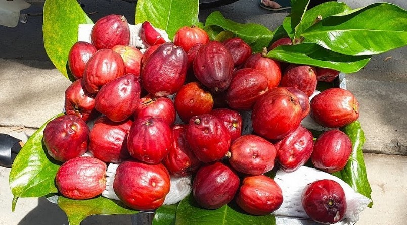 Quả mận điều đỏ là loại quả ăn vặt độc đáo với hình thù không khác gì quả roi, thế nhưng hương vị thơm ngon và rất được ưa thích. Có thời điểm loại quả này có giá bán lên tới 130.000 đồng/kg nhưng vẫn cháy hàng.
