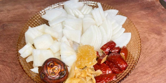 Củ cải trắng - 1 củ, lê - 1 quả, bách hợp (tỏi rừng) - 10g, táo đỏ - 3 quả, đường phèn vàng - 1 chút, củ mã thầy - 1 hoặc 2 củ (có thể bỏ qua), 1 xíu muối.