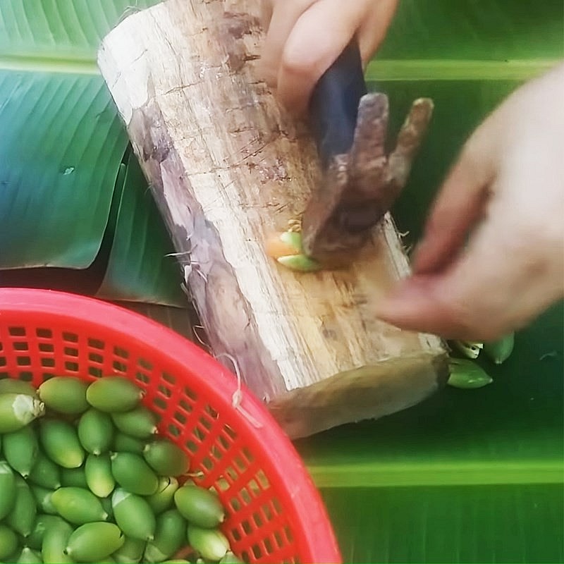 Dùng chày hoặc búa đập nhẹ phần vỏ xanh để lấy phần ruột cau