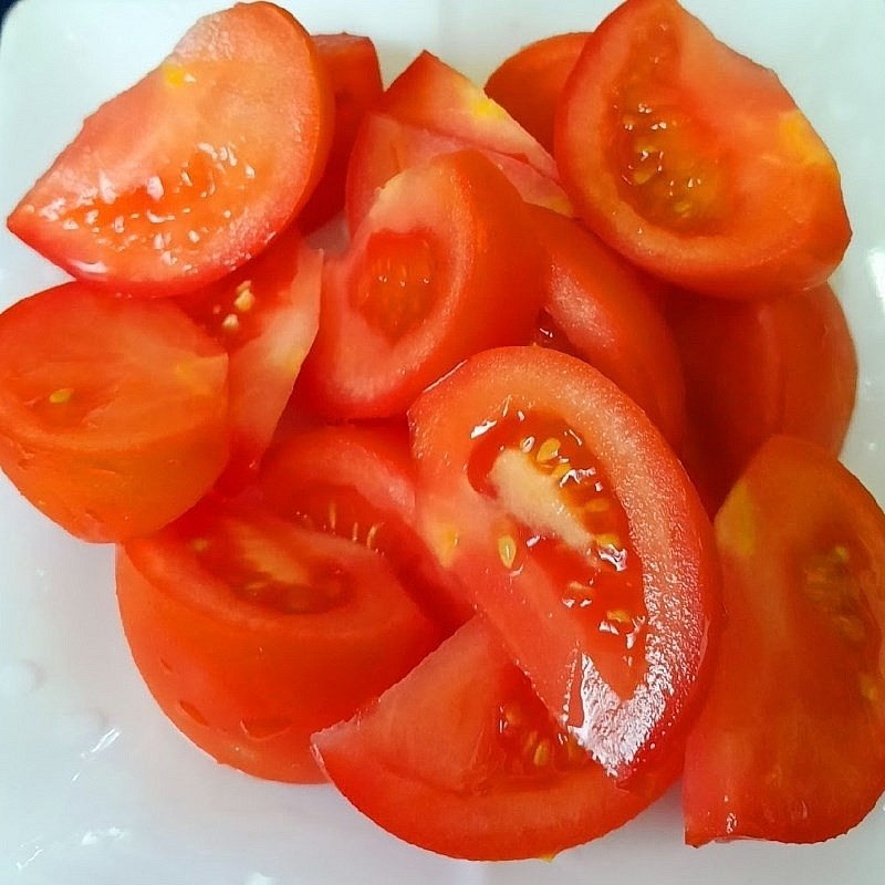 Bước 2: Cà chua rửa sạch, thái thành từng miếng nhỏ. Trong loại quả này còn giàu axit hữu cơ, ăn cà chua thường xuyên sẽ giúp thúc đẩy hệ tiêu hóa, tăng cảm giác ngon miệng.