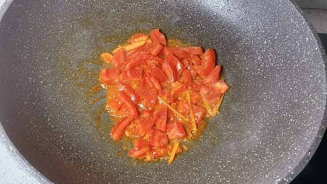 Bước 3: Đun nóng dầu ăn, phi thơm gừng, ớt rồi trút cà chua vào xào chín. Đảo liên tục cho cà chua chín mềm, không bị cháy. Thêm 1 bát con nước để tạo thành sốt sánh sệt.