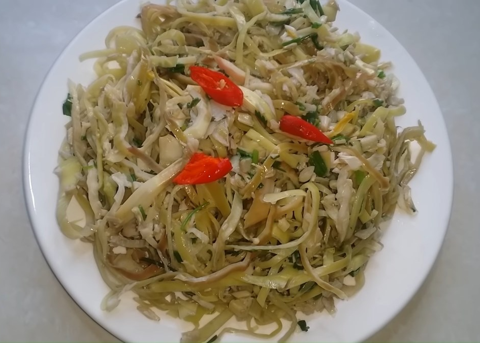 Đây là món ăn vô cùng hấp dẫn. Từng sợi hoa chuối được xào chín tới rồi nêm nếm thêm mẻ tạo ra vị chua thanh vô cùng thơm ngon. Món ăn này thích hợp với những tín đồ ưa của chua.