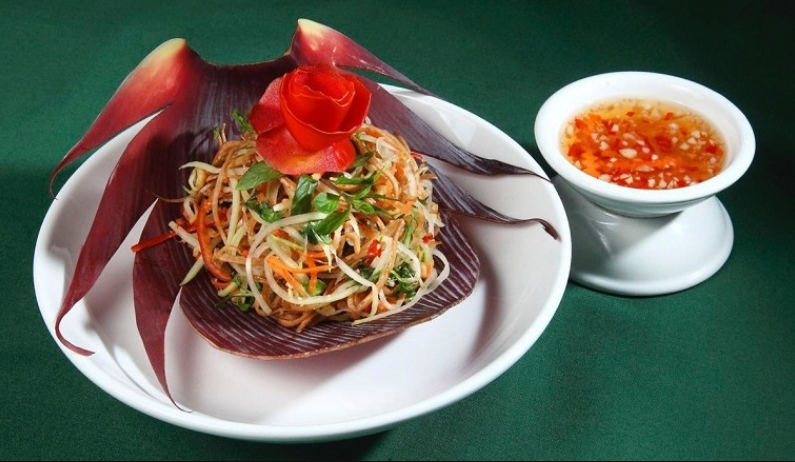 Gỏi hoa chuối với đầy đủ màu sắc từ các nguyên liệu trộn với nhau. Hoa chuối giòn giọt, không bị đen thấm đều nước trộn gỏi chua cay, đậm đà. Rau thơm được bóp gỏi cùng hoa chuối nên tăng thêm mùi vị cho món ăn. Ngoài ra, bạn có thể kết hợp thêm tôm, tai lợn hoặc thịt gà để bổ sung chất dinh dưỡng.