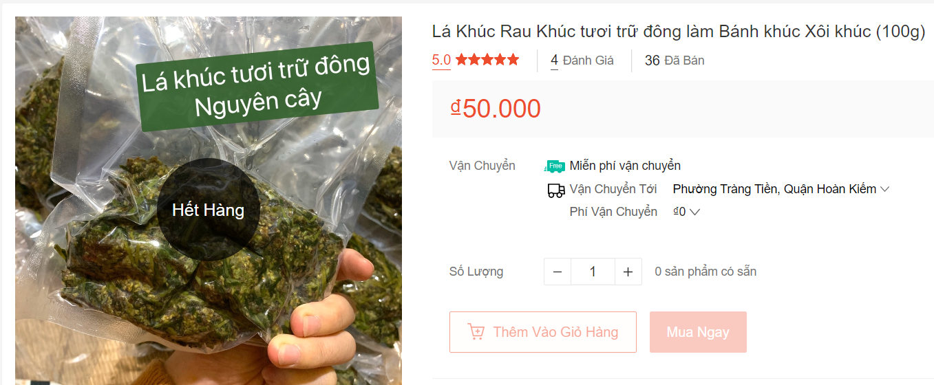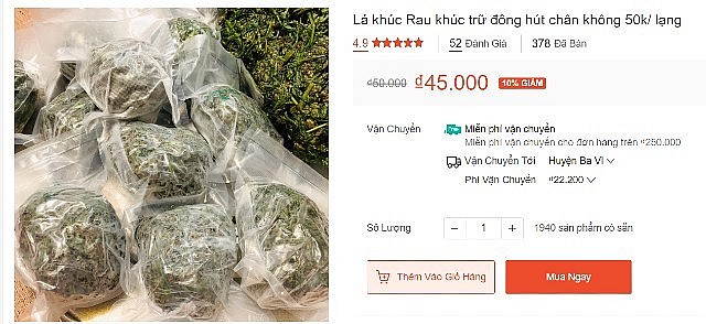 Hiện, trên các sàn thương mại điện tử (TMĐT), cây rau khúc được bán với giá cao, 100gr lá khúc có giá dao động từ 45.000 - 50.000 đồng, tức 500.000 đồng/kg. Tuy giá cao nhưng vẫn không đủ bán, nhiều trang TMĐT thậm chí còn thông báo hết hàng.