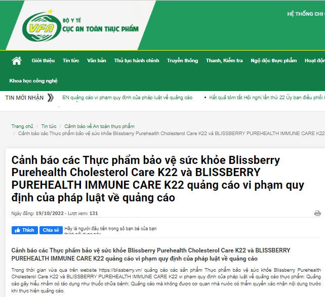 Cục An toàn thực phẩm cho biết trong thời gian vừa qua trên các website https://blissberry.vn/ có hành vi quảng cáo các sản phẩm TPBVSK Blissberry Purehealth Cholesterol Care K22 và BLISSBERRY PUREHEALTH IMMUNE CARE K22 vi phạm quy định của pháp luật về quảng cáo thực phẩm.