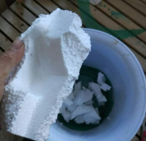 Bạn có thể lót bẻ nhỏ những miếng xốp và lót ở nửa dưới chậu, sau đó mới đổ đất trồng cây lên trên. Cách này không giúp có lợi cho sự phát triển của cây mà còn giúp chậu cây không nặng, dễ di chuyển.