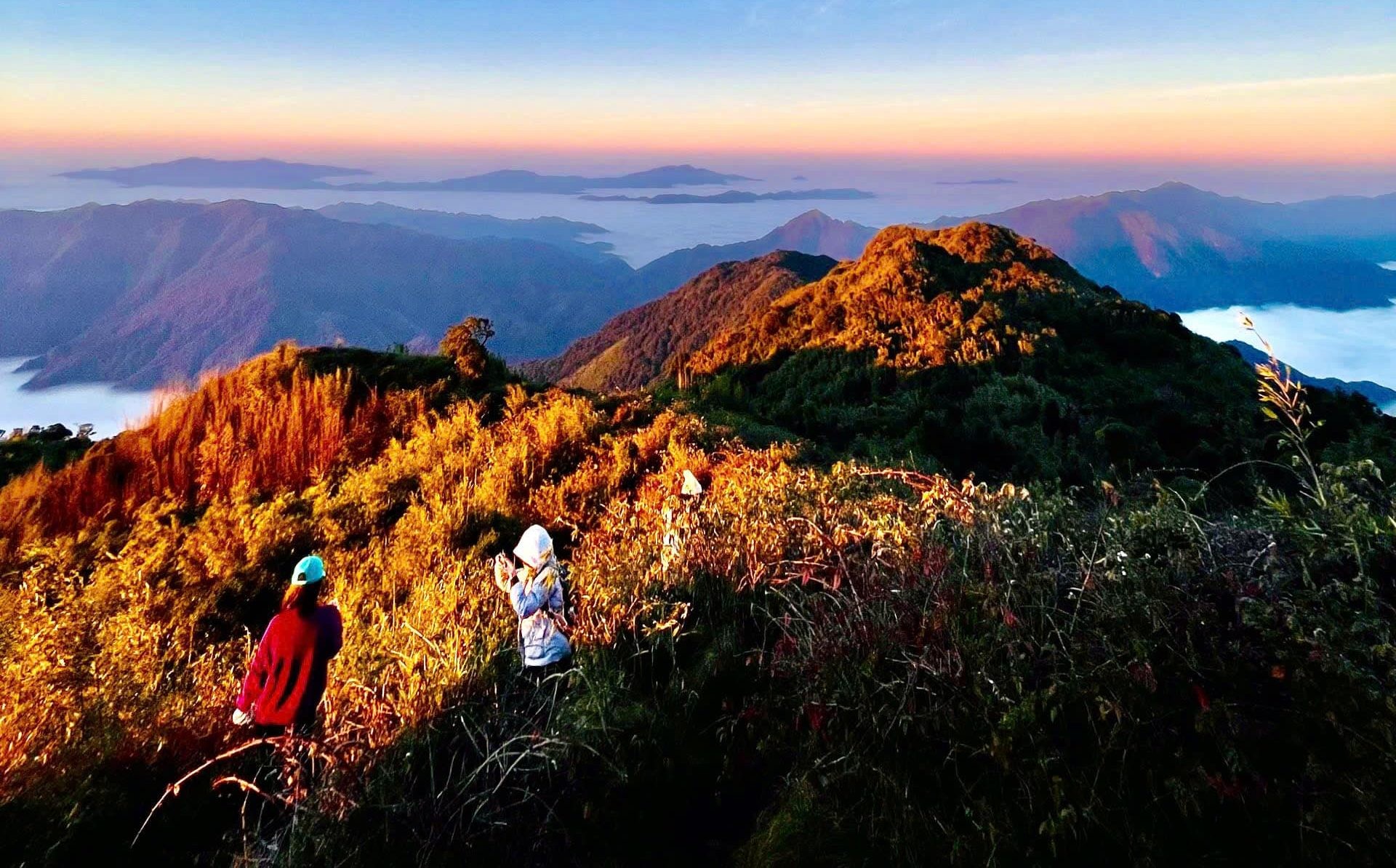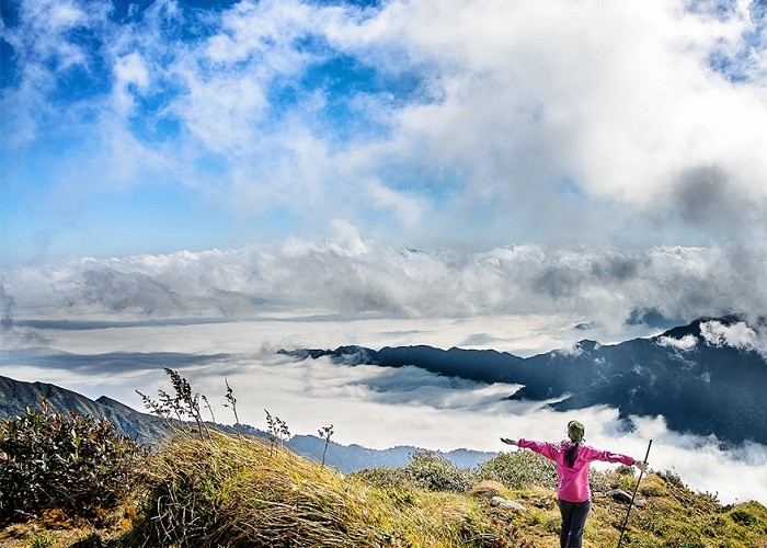 Ngày thứ hai là giai đoạn thử thách nhất – cung đường dốc thẳng đứng lên đỉnh. Không khí loãng dần, hơi lạnh buốt len vào từng lớp áo. Mồ hôi thấm ướt nhưng gió núi lại khiến cơ thể lạnh ngắt. Mỗi bước chân đặt lên nền đá ẩm như một cuộc chiến với chính mình. Nhưng rồi, khi rừng mở ra, trước mắt là khoảng trời trắng xóa của biển mây, tất cả mệt nhọc như tan biến.